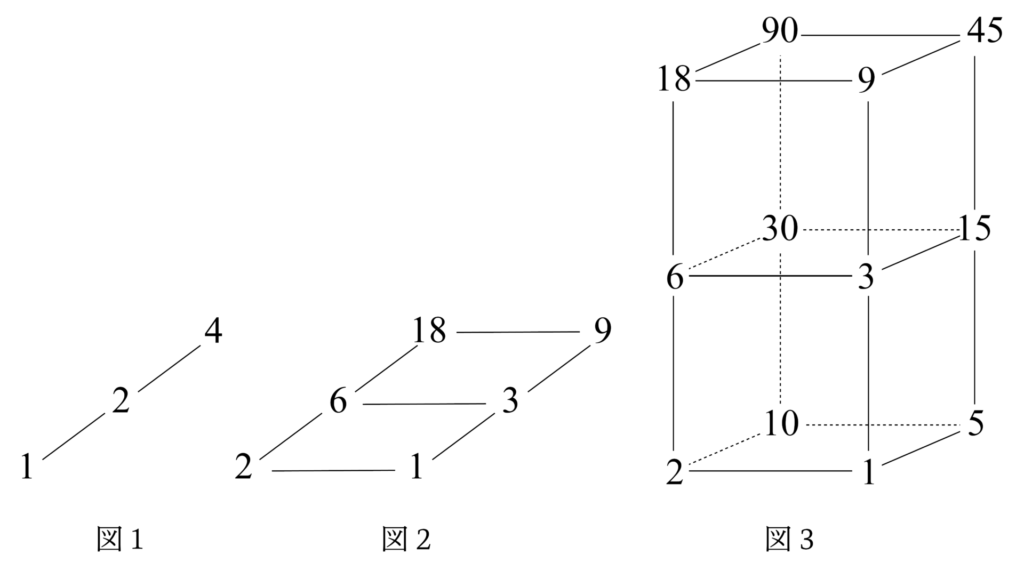 $1$つの整数に対し、ある規則にしたがって約数を配置した図形をつくります。約数を配置した点を頂点と呼ぶことにします。例えば、$4$に対しては$4 = 2\times2$だから、図$1$のような頂点の個数が3個の直線がつくれます。$18$に対しては$18 = 2\times 3\times 3$だから、図$2$のような頂点の個数が$6$個の長方形がつくれます。$90$に対しては$90 = 2 \times 3\times 3\times 5$だから、図$3$のような頂点の個数が$12$個の直方体がつくれます。このとき、次の問いに答えなさい。
